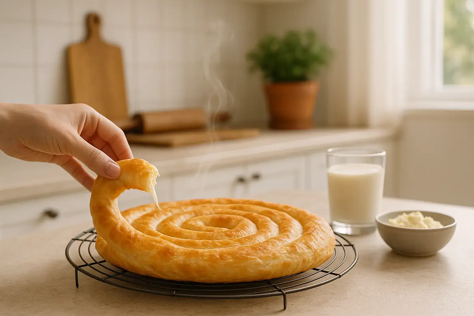 Pečena razvučena pita izvađena iz rerne, prekrivena kuhinjskom krpom, uz čašu mleka na stolu.